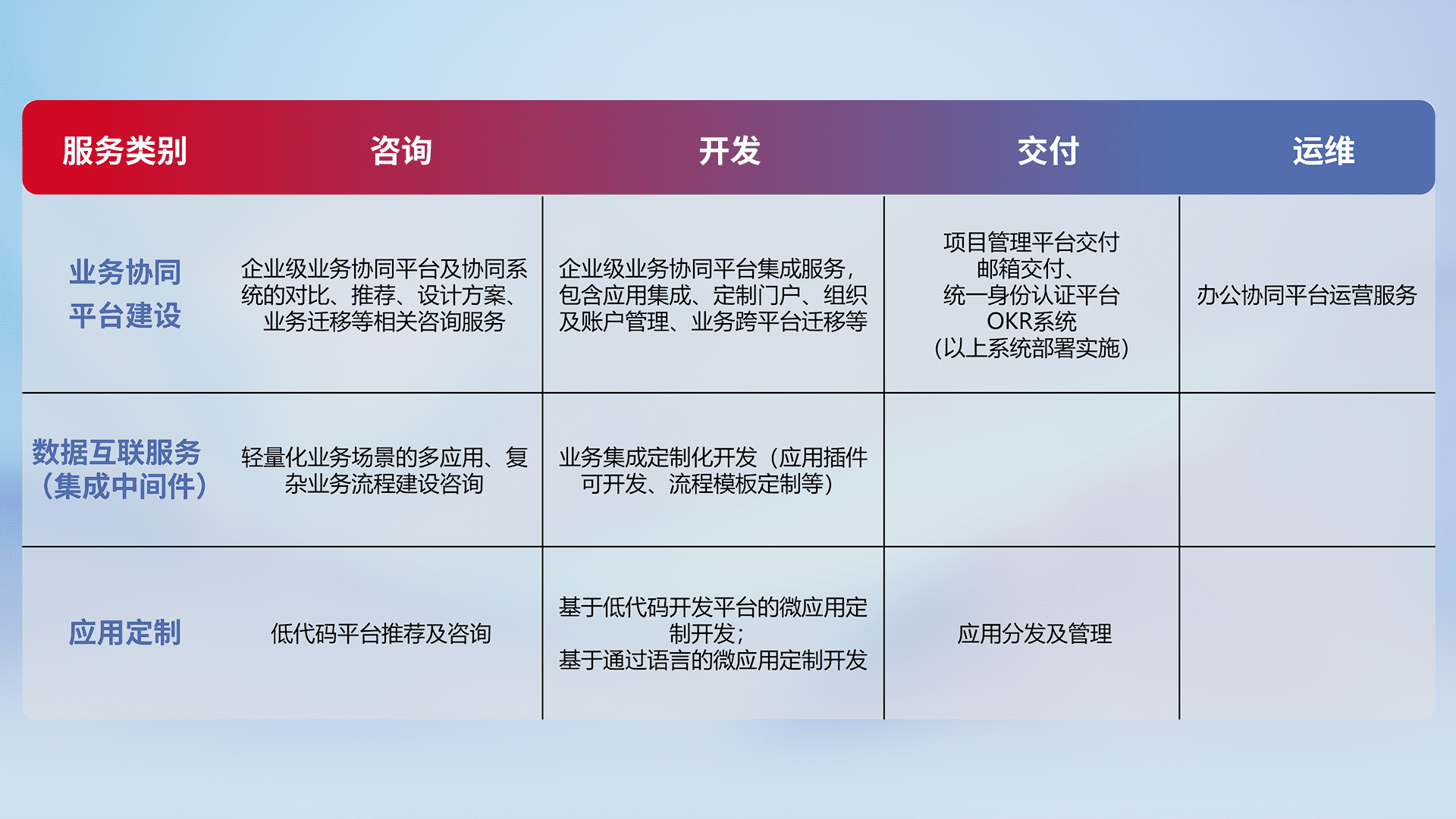 针对钉钉、、企微、、、IDaas等平台级产品提供产品的规划、、、方案、、、交付、、、、定制化开发等服务,,实现如统一协同办公、、智能客户服务、、、、混合会议管理、、、、智能数据查询、、等业务场景,,,实现数字化转型。。